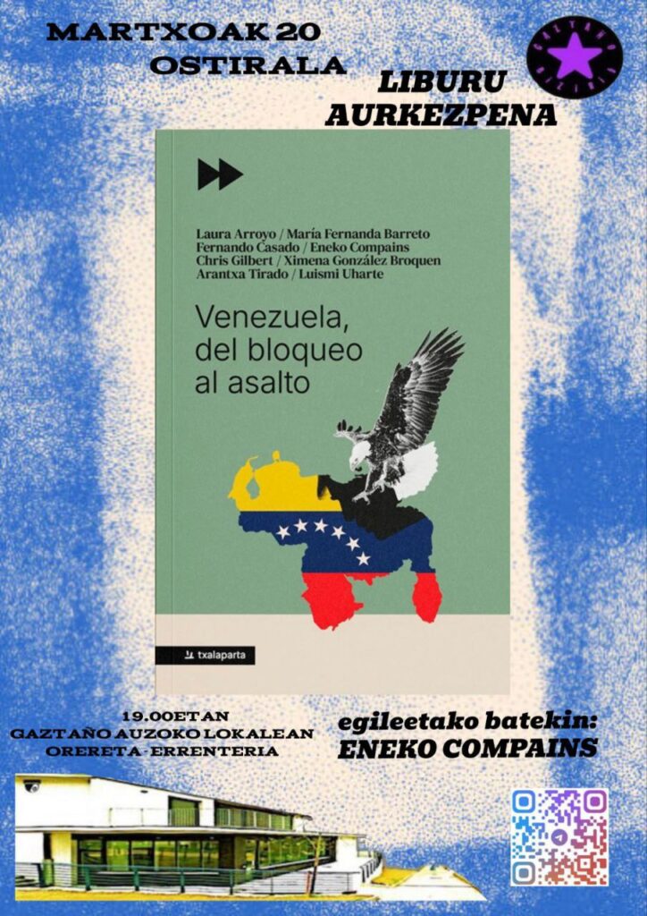 El acto se realizó en el Lokal47 de la AVV Gaztaño. El ponente, uno de los autores, Eneko Compains explico la situacion venezolana despues del asalto del ejercito de EEUU que asesinó a casi un centenar de civiles y militares venezolanos y secuestró al presidente Nicolás Maduro y su esposa Cilia Flores a los que trasladó a una prisión de Nueva York y que puso en marcha mecanismos de sostenimiento de la administracion y gobierno bolivarianos. Hoy por hoy es importante escuchar estas voces para conocer de primera mano la situación de la Resistencia Venezolana.