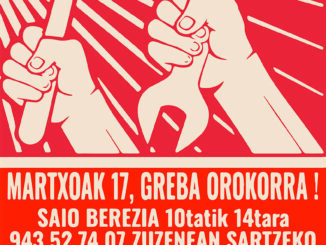Datorren martxoaren 17an deitutako greba orokorraren testuinguruan, Zintzilik Irratiak irratsaio berezi bat eskainiko du Hego Euskal Herrian bizi den egoera sozial eta laboralari buruzko informazioa, […]