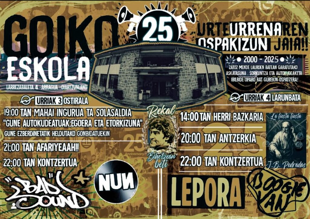El pasado Octubre, los días 3 y 4 se consumó el 25 Aniversario de la okupa GoikoEskola, para ello organizaron diferentes actos en un finde intenso. Os traigo la mesa redonda de Goiko Eskola sobre la Autogestión-la pena es que, al grabarla con 4 canales, se me acabó el espacio en la tarjeta de memoria y sólo grabó 1h 15m- nos comentaba el arrano de la grabación. Participaron: Gaztetxe de Andoain, Zintzilik irratia, Buenavista, Minas de Arditurri, Goiko Eskola y Txerrimuño.