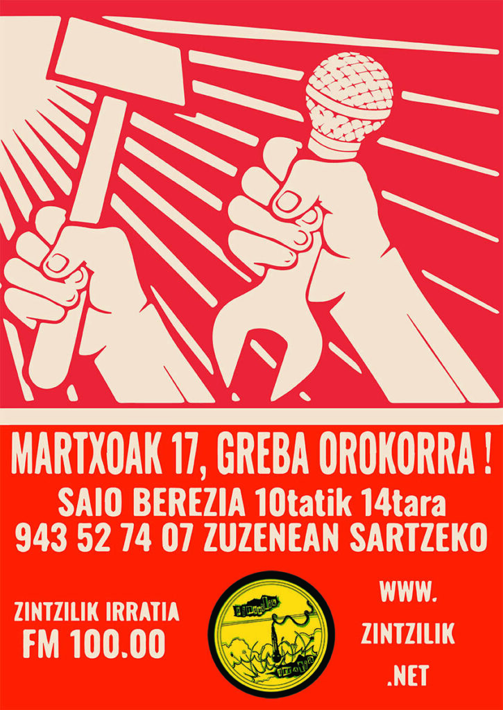 Zintzilik Irratiak herritarrei dei egiten die martxoaren 17an informazioa jarraitzera, mobilizazioen berri izatera eta irratsaioan aktiboki parte hartzera.